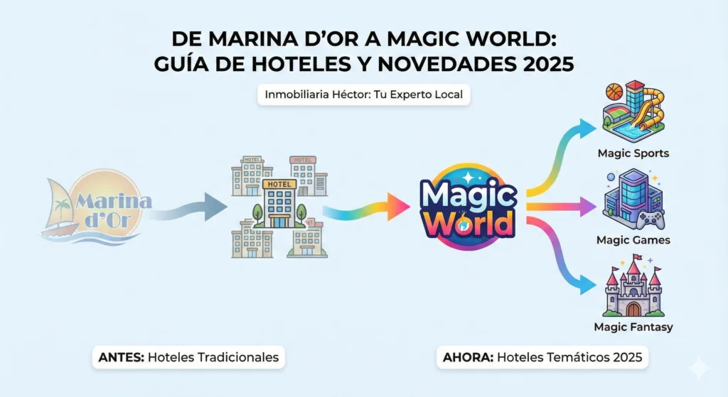 ¿El Hotel Gran Duque sigue existiendo? ¿Qué es Magic Sports? Si veraneas en Oropesa, el cambio de Marina d’Or a Magic World puede generar confusión. En esta guía definitiva desglosamos la equivalencia exacta de cada hotel, te mostramos las nuevas atracciones temáticas para 2025 y te revelamos la ‘Estrategia Híbrida’: cómo disfrutar de toda la diversión del nuevo resort alojándote en un apartamento privado por la mitad de precio.